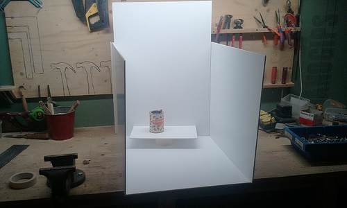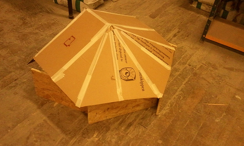 When we were done with the photo box and the scale model, we had to store them somewhere. The photo box sits in the ceiling, on top of some well-insulated pipes. The model was dismantled, to be re-built and perhaps even painted, at a later date. Needing a Barbie to stand next to it.