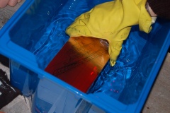 Blanda etsvätska enligt anvisning - 1 dl etspulver för 1/2 liter kokhett vatten. Detta ger en lösning som håller strax över 50 grader - perfekt för etsning. Häll vätskan i etskar eller plastlåda och lägg i kortet. Etsningen tar cirka 5 minuter. När etsningen är klar ska kortet ommedelbart tvättas noggrannt i ljummet vatten.