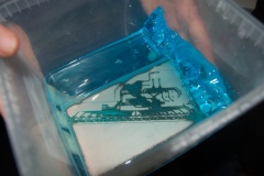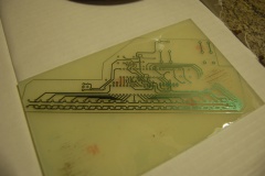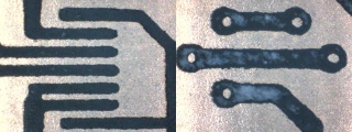 Nu är det bara ett litet steg kvar innan kortet är klart att borras. Ta lite aceton på en trasa och tvätta kortet lätt och snabbt. Acetonet löser upp resterande fotoresist, oavsett om denna uv-exponerats eller ej.