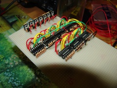 The schematics shows a display that has 64 columns but in practice we only managed to fit 50. Simply removing or repeating more XDRV (see schematic) circuits will allow you to construct a display with any number of columns you choose, given that the source code "#define"s are modified accordingly. Although the provided code does not support it you could also, in theory, add more row drivers by adding more YDRV circuits and additional 3-8 decoders - hooking up their enable pins to the remaining microcontroller outputs. Somewhere along the road you will need a faster CPU though. 64x7 is near what this processor is capable of displaying (using my method of font storage) without significant flickering. Memory is also a consideration.