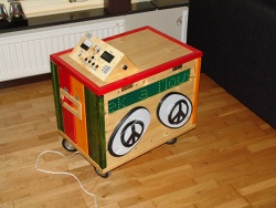 The goal was to design, build and program a music box for the 2009 Roskilde Festival in Denmark, in the five days leading up to the festival. All features except the remote control were implemented. Additionally, the control panel was fitted with a flashing power indicator, a battery voltage guage and a temperature sensor. An aux. audio input jack was also installed in the USB hatch.